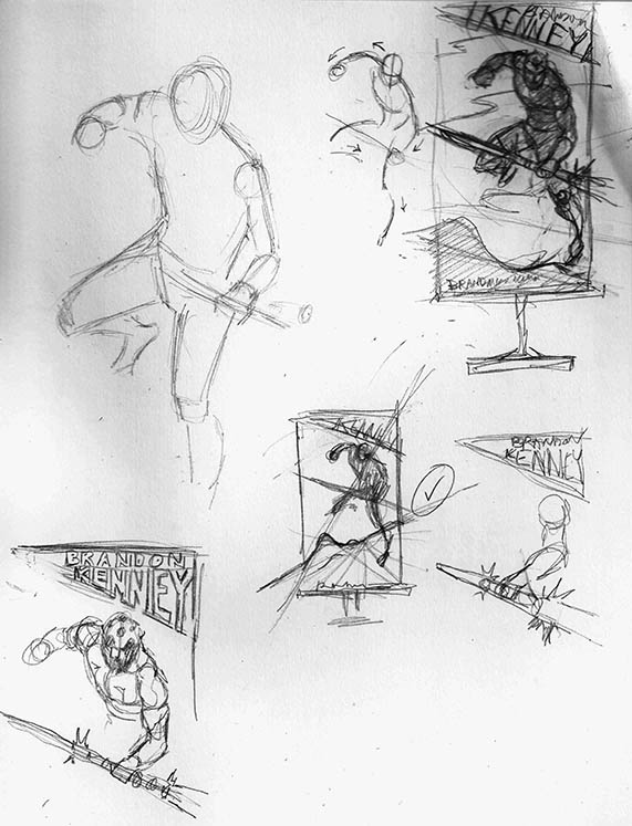 Step 1 – The basic thumbnail sketches. I had a few pages of these, but I already had a concept strongly imprinted in my mind and I was a bit too stubborn at this point to really think about anything else so I decided to run with it. I prefer to be more open minded at this stage, but sometimes it’s hard when you already have that image floating around in your head.