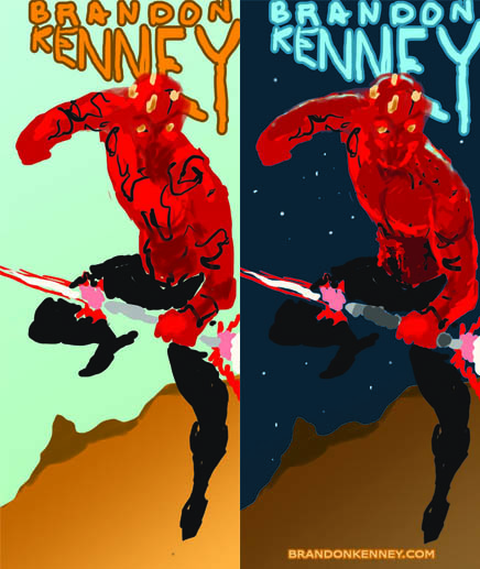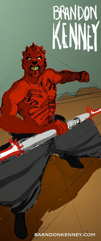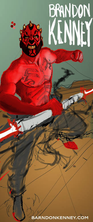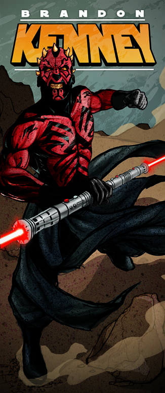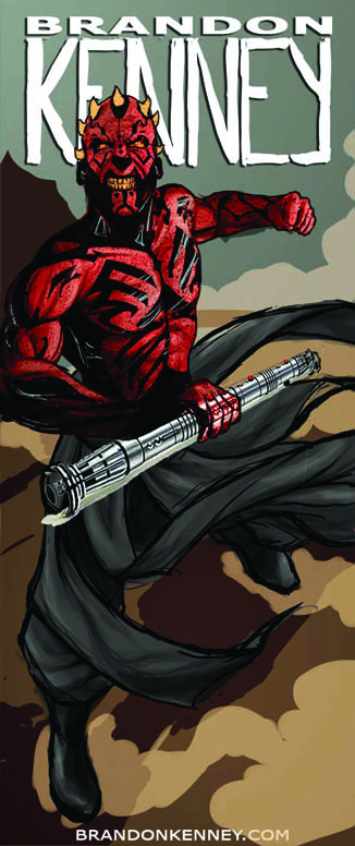 Step 11 – The final artwork! The last steps were reverting to the previous color scheme and adding all the last minute details: Bringing out the shine in the saber and the glow in the blades. Adding a cast shadow under Maul and texture to the sky and text. If I had more time I’m sure I would have done more, but I was very happy with the final result, and even happier with the printed banner once it arrived. I hope you enjoyed this little step by step, I’d like to do more when I get the time. Thanks!