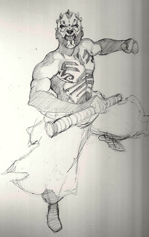 Step 3 – Back to pencil and paper. I ended up not liking the original concept and opted to place Maul in a different location. Now I shoot a little photo reference and test out a pencil sketch. The reference (not shown) is just me in front of a mirror holding a cardboard tube. I’m not entirely certain how to handle the lower half of Maul’s body at this point so I leave it rough and scan in what I’ve got.