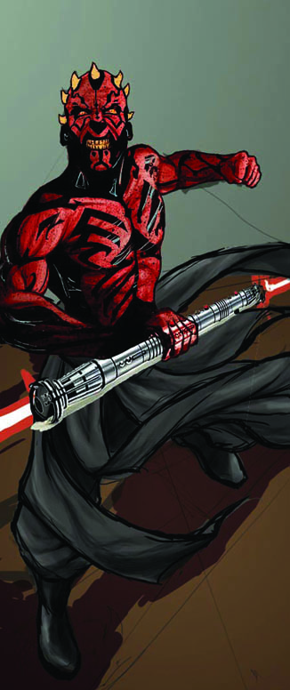 Step 5 – After seeing the new sketch with color in its overall composition I realize Maul is too short and stubby. This is easily remedied digitally by just stretching out the rough pencils and making minor adjustments. I also decide to redraw the lower half of his body and try solve that problem. It’s at this part of the process that the banner starts to take its final shape. This is probably my favorite part.
