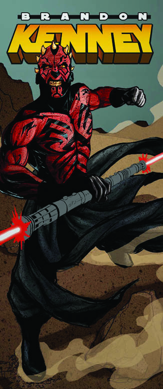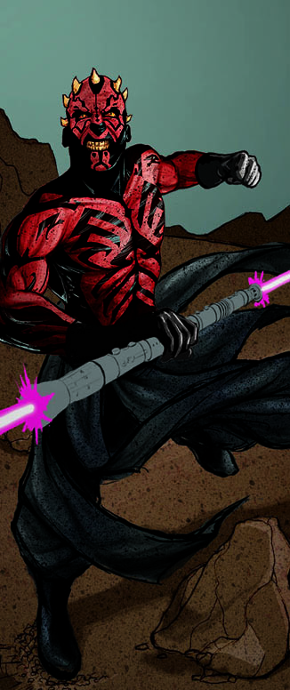 Step 9 – After I scan in the pencil work I add different layers of detail and splatter to Maul and the background. I also make slight adjustments throughout the process because it never looks perfect. Here I noticed his head was just a little bit too big and I shrunk it. I is hardly noticeable, but when you see it I think you’ll agree it makes a big difference. I’m never happy to settle with the colors and each time I get a chance I’ll try to alter them a bit and see if it works. I usually set the colors save a copy of the file and walk away for 30 min to an hour before I come back and see it it’s working. It’s important to try and keep a fresh perspective.